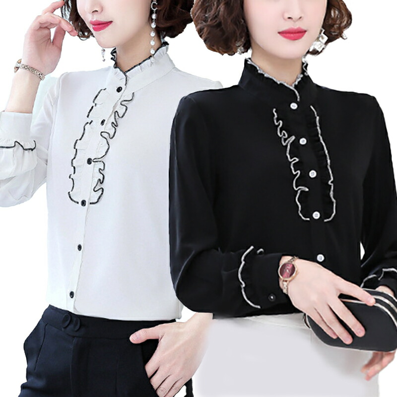 トップス レディース 秋冬 ブラウス 長袖 スタンド ネック パイピング ニット リブニット フリル きれいめ 大人 上品 大人可愛い シャツ 春 セクシー 30代 40代 黒 白 バ 50代