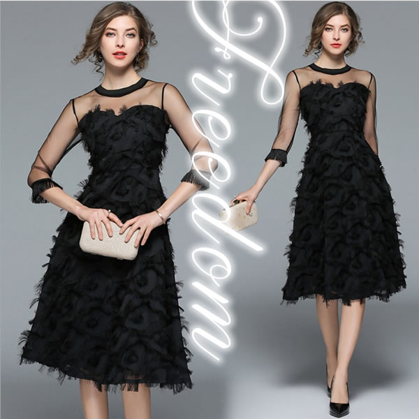 キャバ 魅惑 ドレス レディース 黒 パブ 長袖 レース タイト スカート エレガント プリーツ 韓国 セクシー